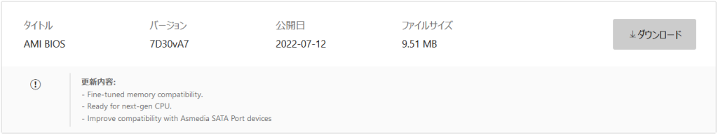 対応するマザーボードの「サポート」リンクから最新のBIOS(UEFI)をダウンロードします。
