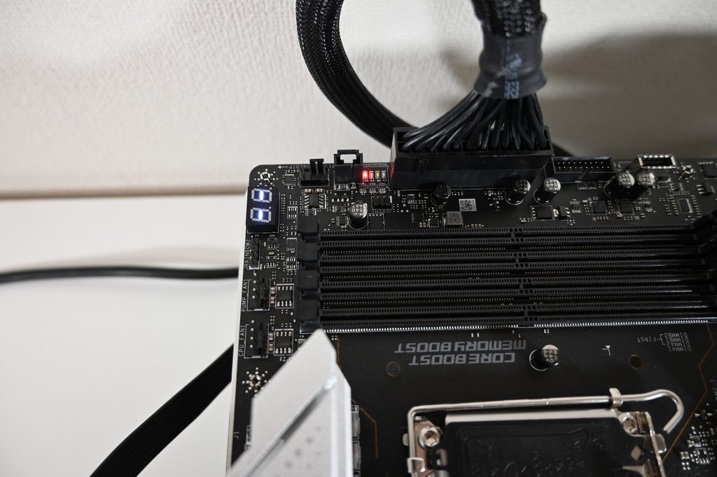 5分後ぐらいに再起動しましたが、当然CPUもメモリも取り付けていないのでUEFIの画面は見れません。デバッグLEDのCPUが点灯してたので強制的に電源をオフにしました。