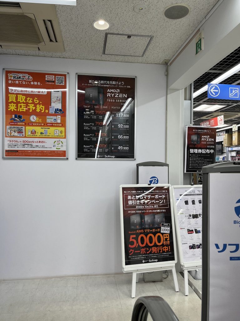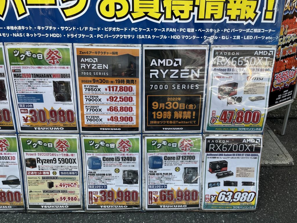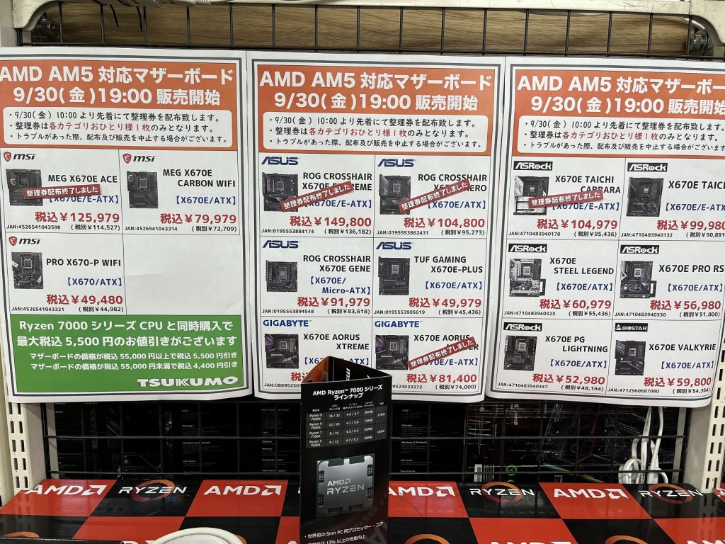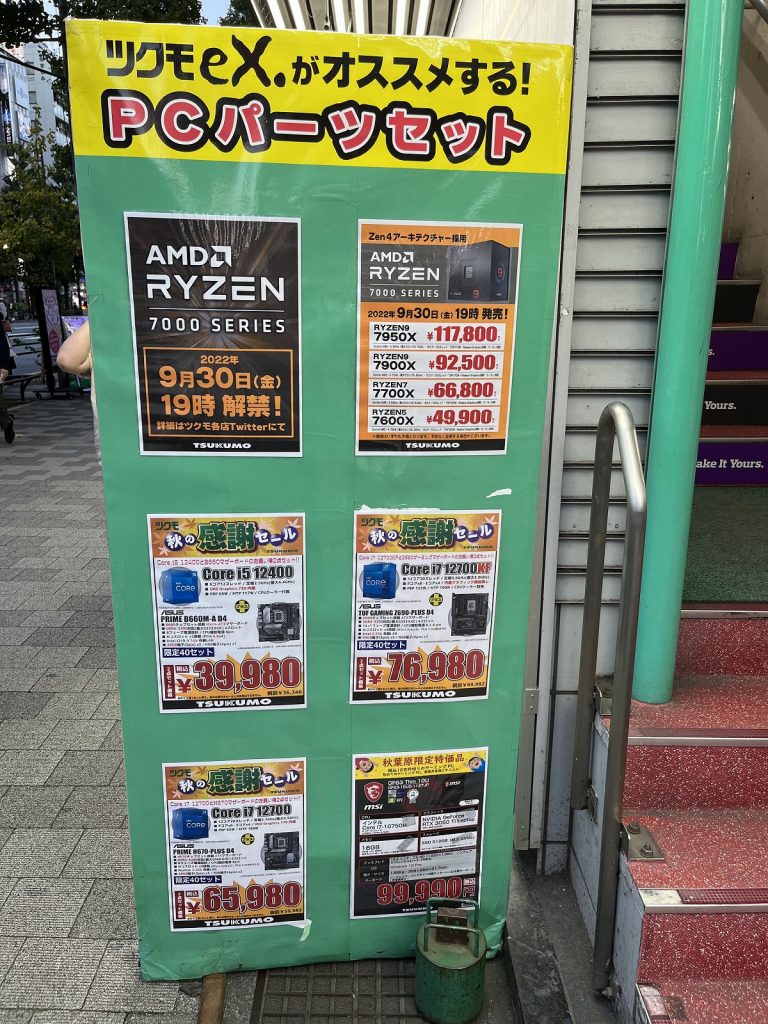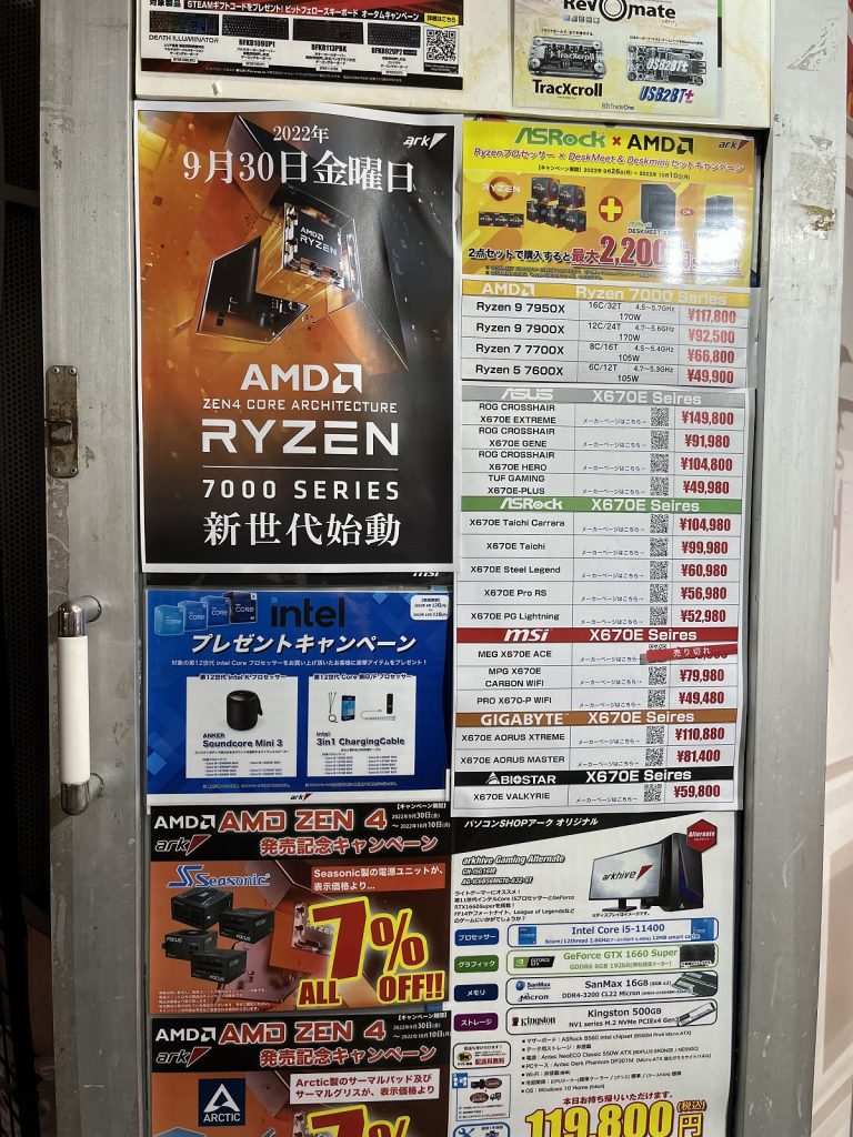 2022年9月30日 19:00からZen 4マイクロアーキテクチャーであるCPU「Ryzen 9 7950X」「Ryzen 9 7900X」「Ryzen 7 7700X」「Ryzen 5 7600X」の4製品及びX670(X670E)チップセットマザーボードが発売するので様子を見に秋葉原へ行ってきました。