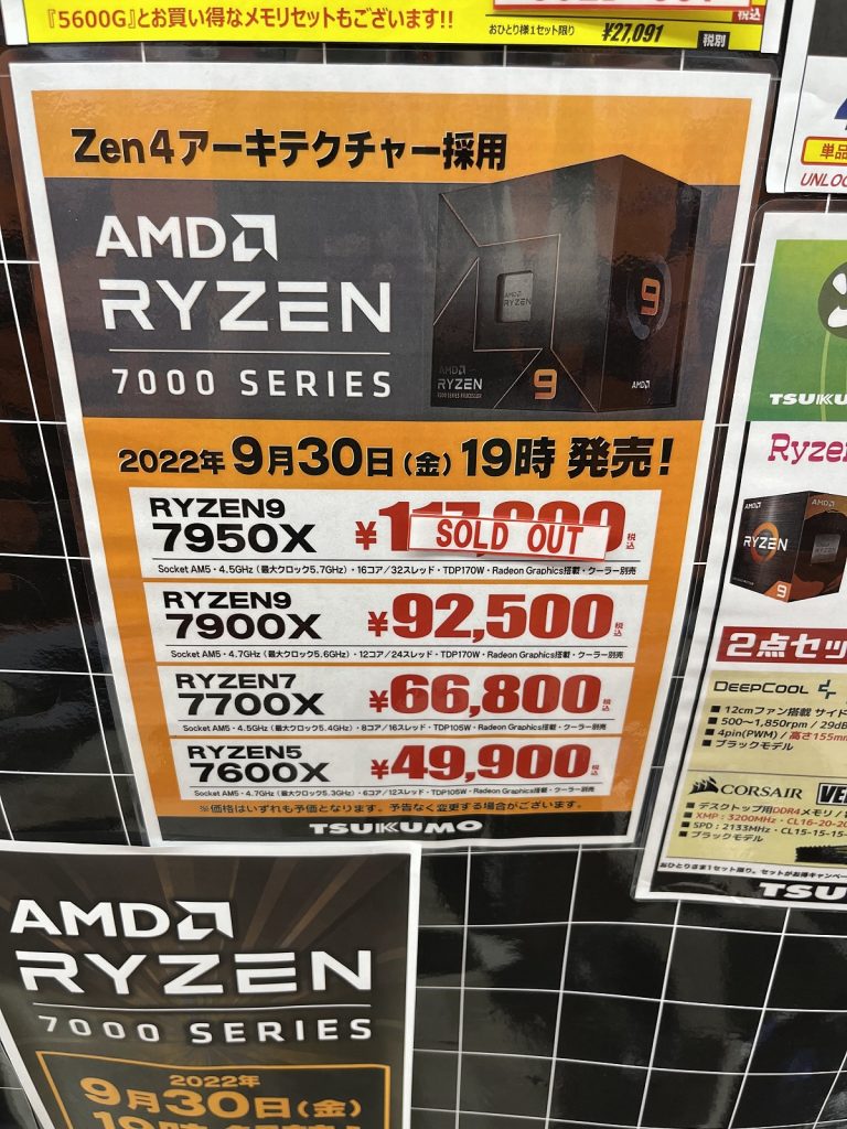最上位のRyzen 9 7950Xは売り切れた店舗もありましたが、19:00時解禁後も購入できるところもありました。次の日には在庫復活してるところもあったのでZen3発売後のようにどこにいっても買えないという状況にはならなかったようです。