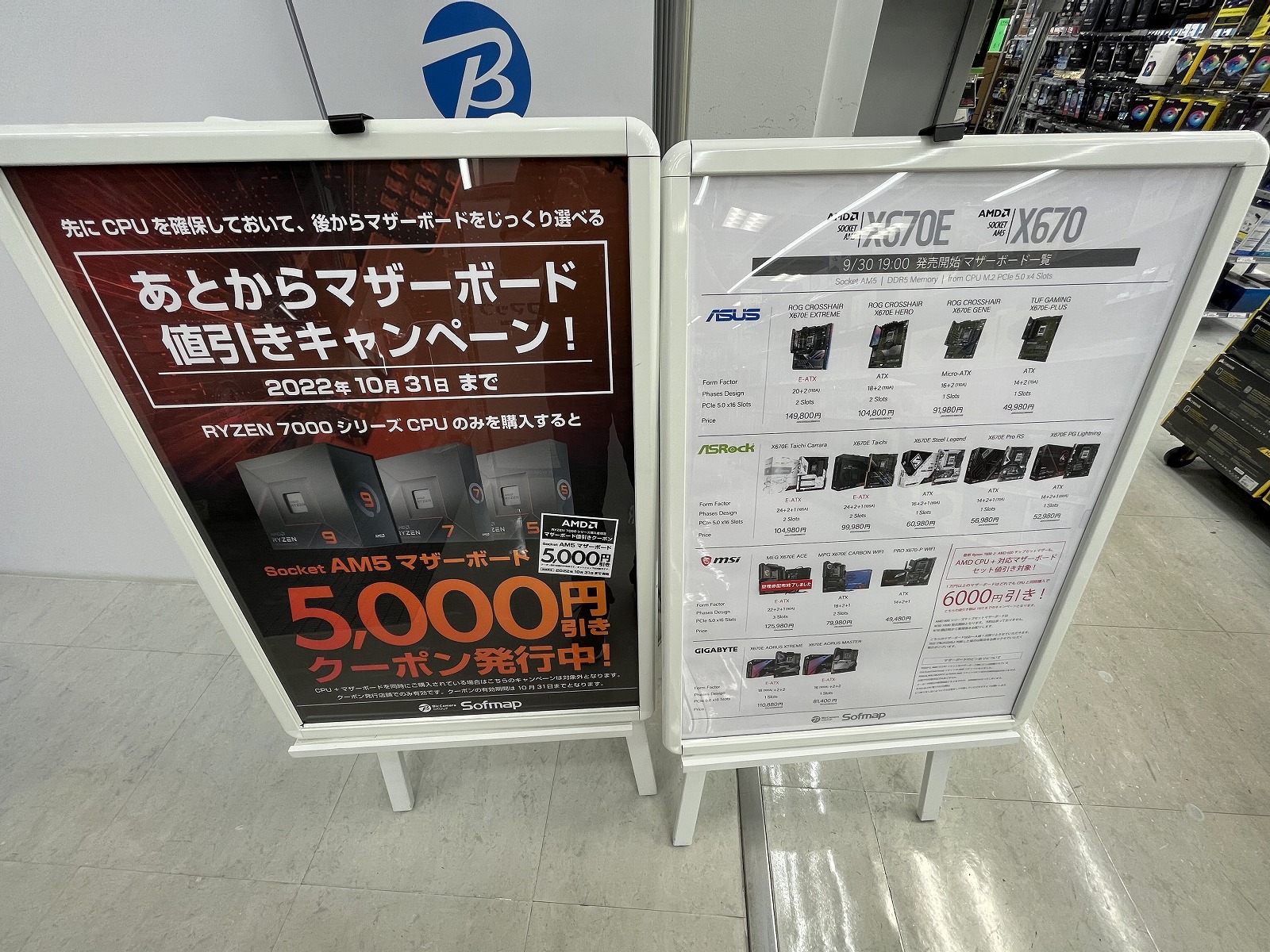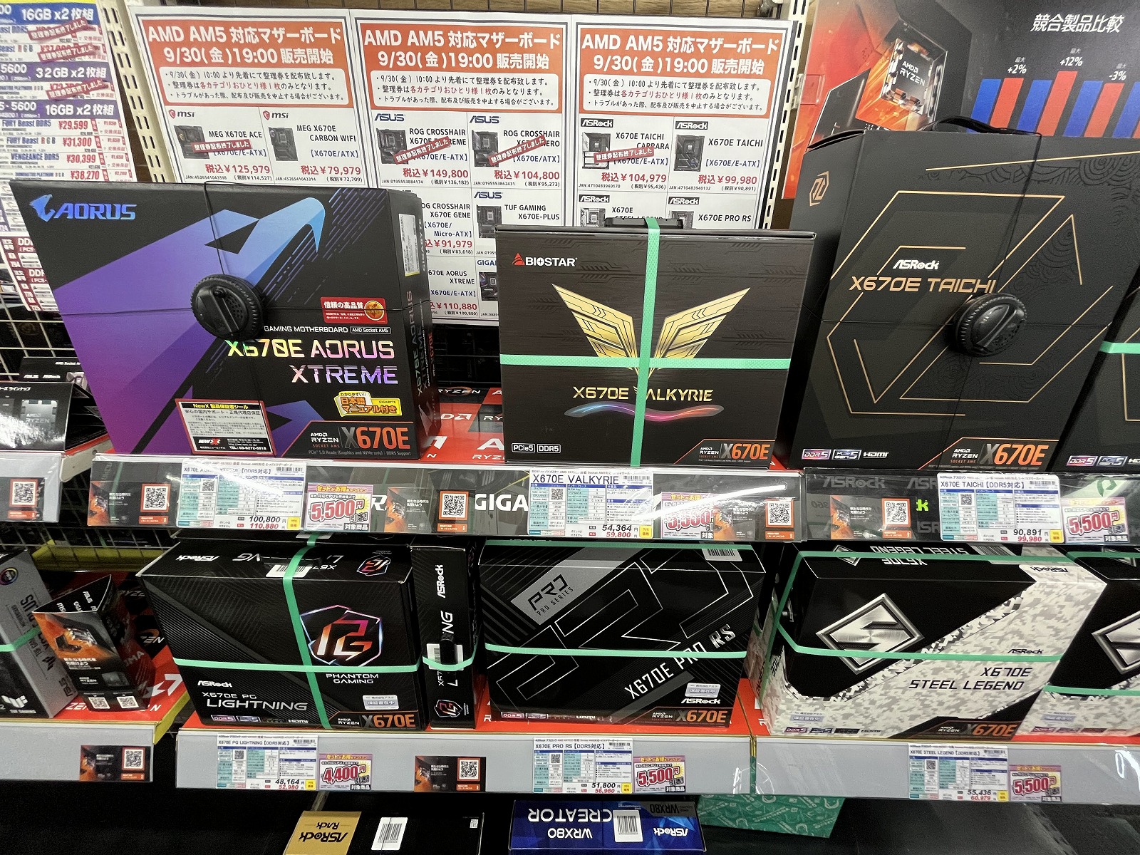 2022年9月30日 19:00からZen 4マイクロアーキテクチャーであるCPU「Ryzen 9 7950X」「Ryzen 9 7900X」「Ryzen 7 7700X」「Ryzen 5 7600X」の4製品及びX670(X670E)チップセットマザーボードが発売するので様子を見に秋葉原へ行ってきました。