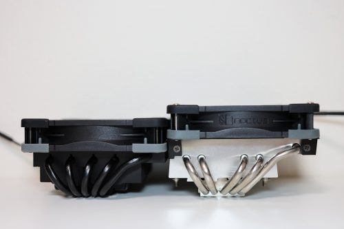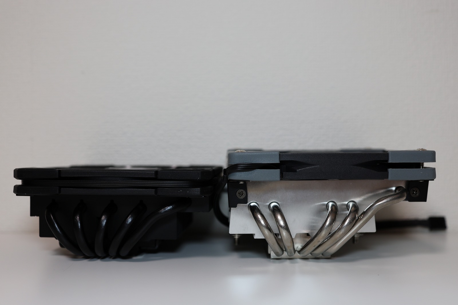 各メーカーでの低背CPUクーラーは15mm厚のファンを組み合わせていますが、限られた高さの場合はヒートシンク大きさを稼いでファンを低くした方が良いというのは業界の常識なのかもしれません。