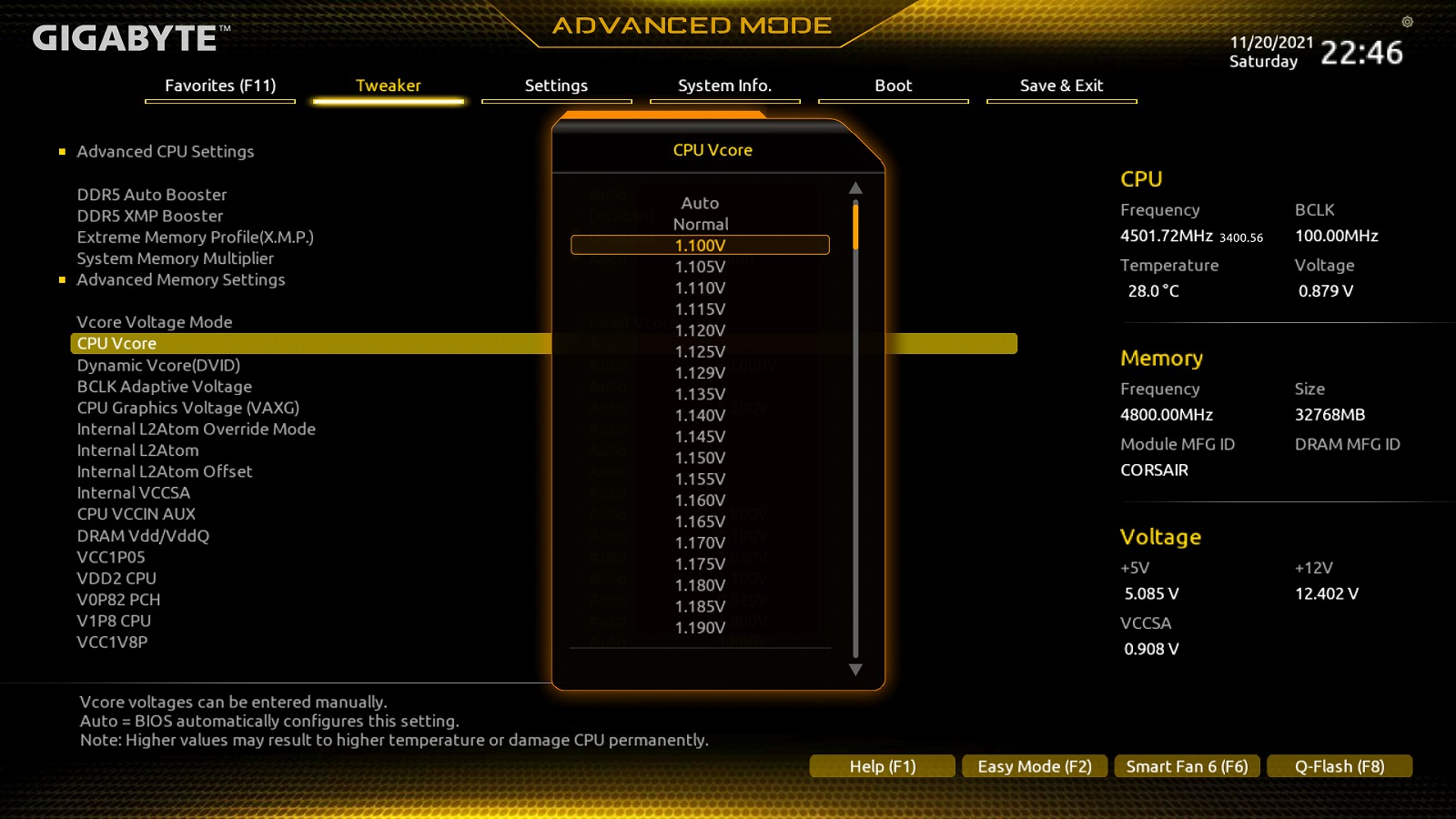 Z690 UDの固定電圧は1.1Vからしか設定ができませんでした。