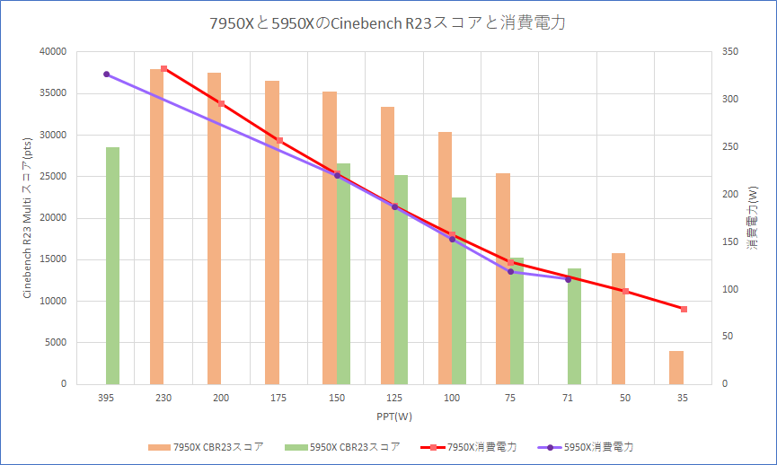7950Xと5950XのPPTを同じ設定にするとIdleが20W差があるのに負荷時に消費電力がほぼ同じになりました。