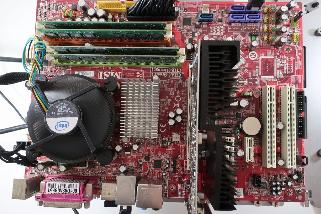 マザーボードの基盤がかなり曲がっていて、負荷をかけると高周波音がキーキー鳴る、アルミ電解コンデンサなのでそろそろ限界を迎えそうな予感。