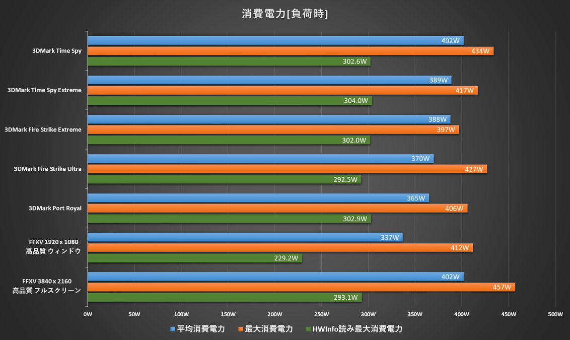 ベンチマーク中の消費電力はシステム全体で平均400W程度、GPU単体はHWInfoは最高300Wあたりを記録しています。