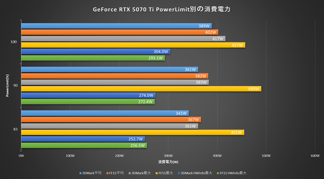 FF15の最大消費電力はスパイク値が複数回計測されるのでPL制限しても不安定な結果となります。