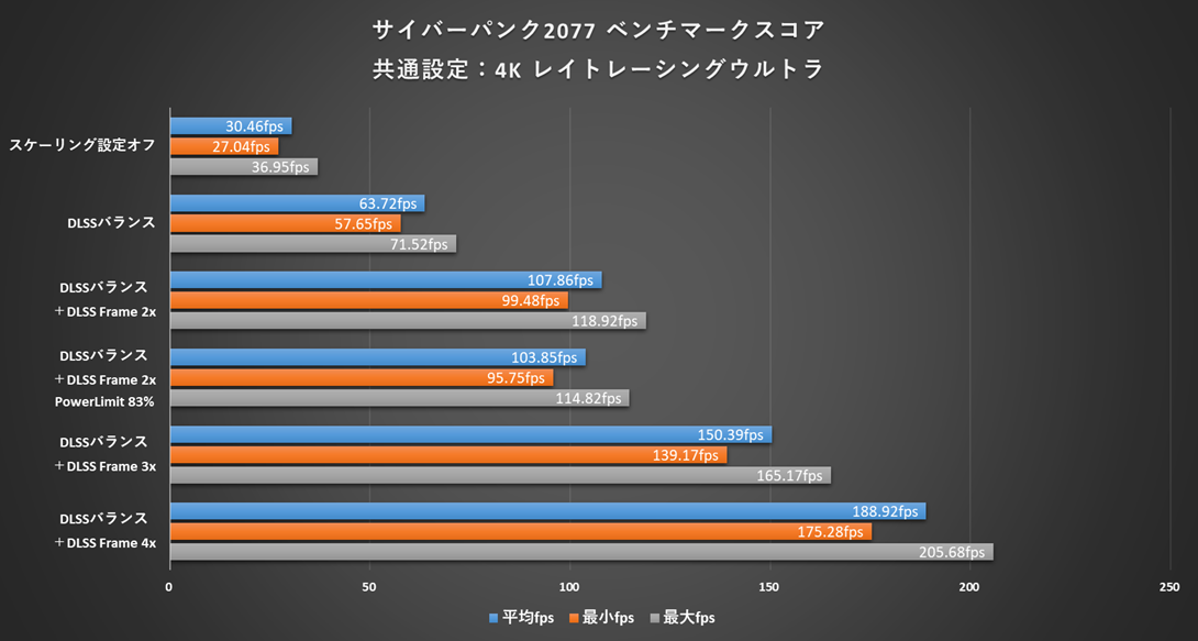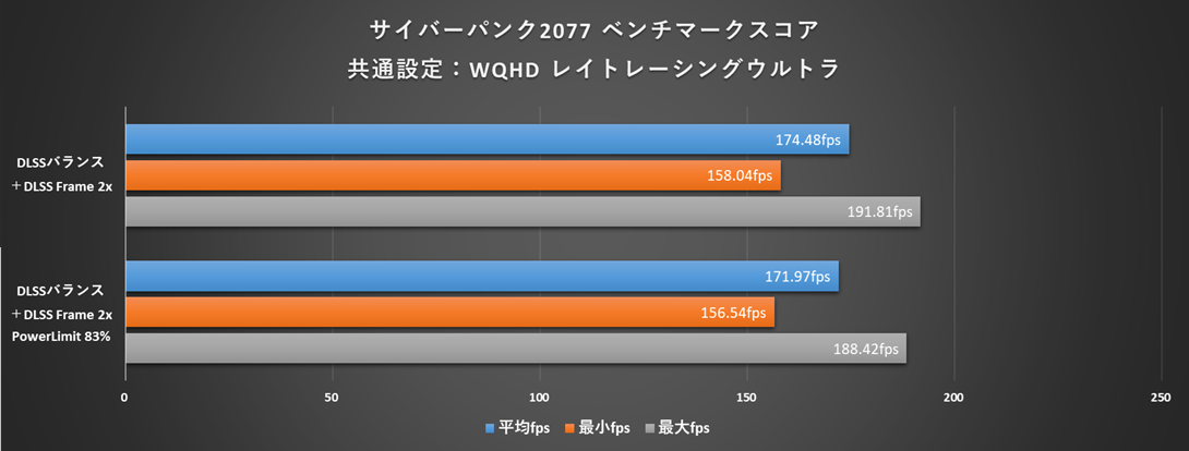 | Cyberpunk 2077 レイトレーシングウルトラ +DLSSバランス +DLSS Frame 2x | 400W | 250.9W |
